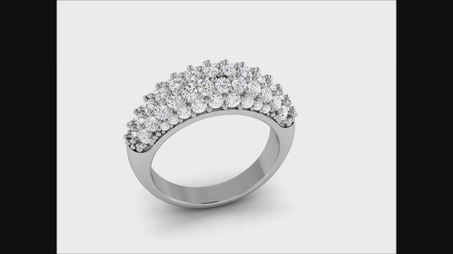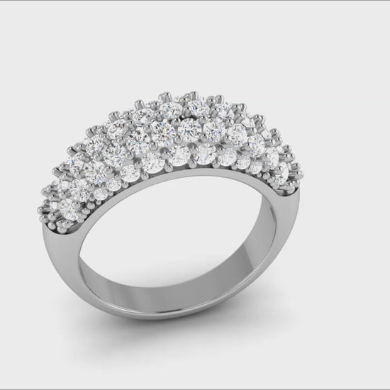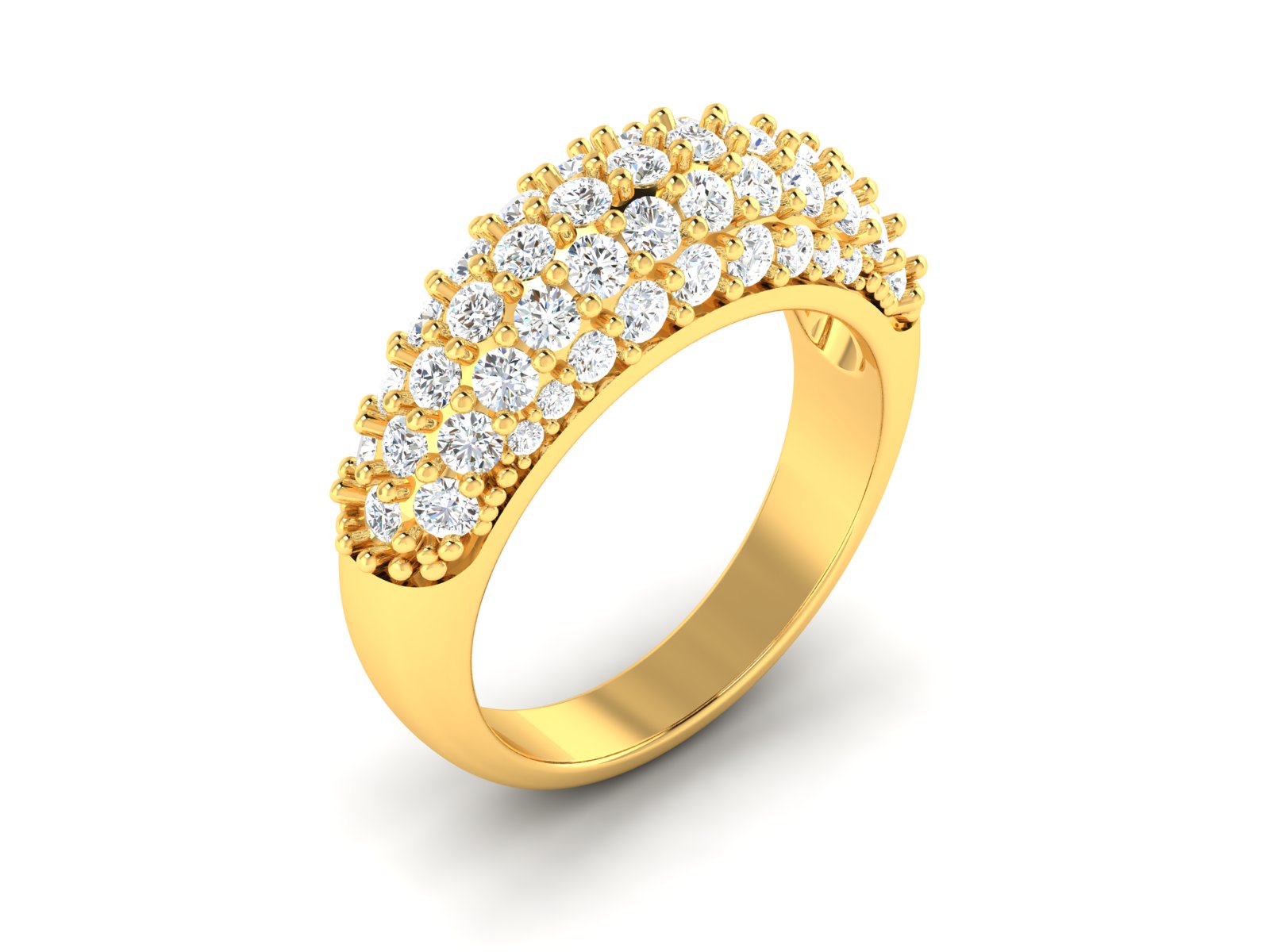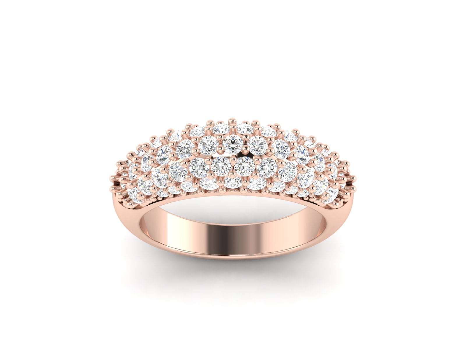 ביונקה היא טבעת קלאסית עם טוויסט מודרני – שלוש שורות של יהלומים עגולים נוצצים משובצות בצפיפות על גבי מבנה בומביי מעוגל, שיוצר תחושת עומק וזוהר אחיד מכל זווית.