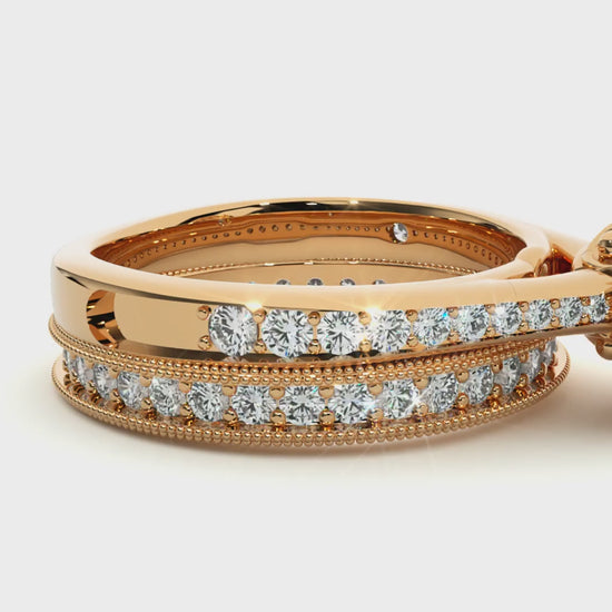 טבעת "הייזל" שואבת השראה מהעיצוב הווינטג'י ומביאה איתה תחושת רומנטיקה נצחית. היהלום המרכזי בוהק בתוך מסגרת Halo עגולה ומעודנת, כשלאורכה של הזרוע המשולשת שיבוץ עשיר בשילוב עיטורי מילגריין עדינים להשלמת המראה. טבעת עם נוכחות עוצמתית, אך גם עדינה ונשית – נולדה כדי להדהים.