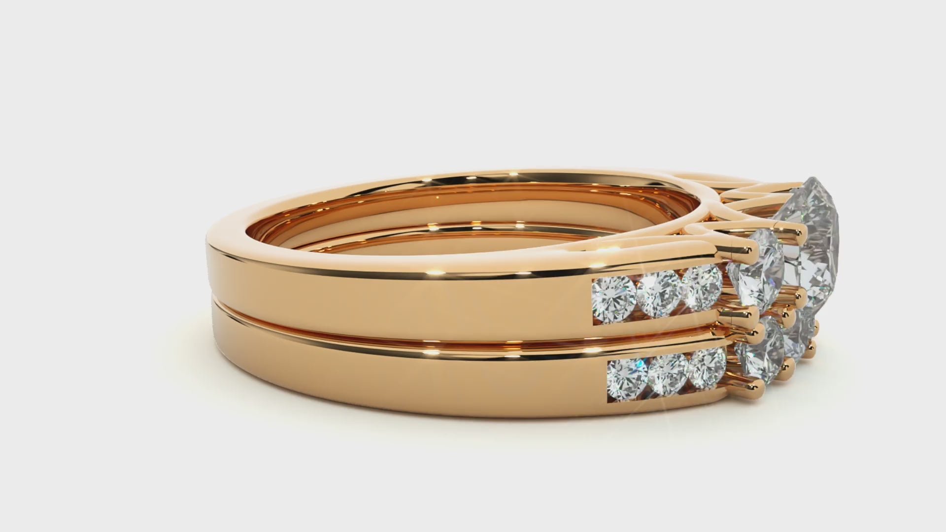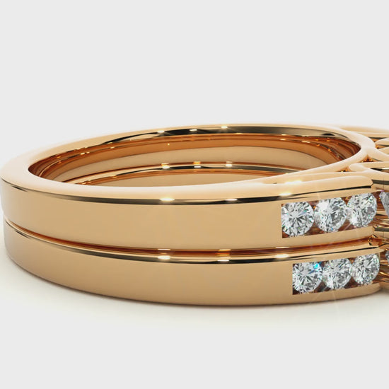 "ריילי" היא טבעת עוצמתית בעלת מראה של סט כפול, אך למעשה מדובר בטבעת אחת מעוצבת בשלמות. היהלום המרכזי העגול נתמך בשורת יהלומים צדדית נדיבה, עם חישוק כפול שמקיף את האצבע בצורה עשירה ונוצצת במיוחד.